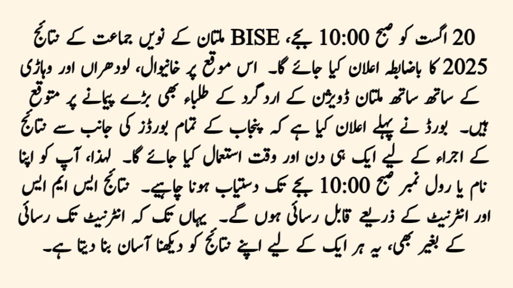 In this article, we are sharing all the details about the BISE Multan 9th Class Result 2025, including how and when to check your result. Whether you want to check by roll number, name, or SMS, all options are available and simple to use. The result will be announced on 20th August 2025 at 10:00 AM. Make sure to keep your roll number ready and follow the steps given above. We hope you get the marks you worked hard for—best of luck!