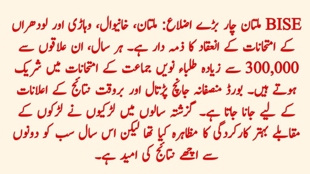 BISE Multan is responsible for conducting exams for four major districts: Multan, Khanewal, Vehari, and Lodhran. Every year, more than 300,000 students appear in the 9th class exams from these areas. The board is known for fair checking and timely result announcements. In past years, girls have performed better than boys, but this year, everyone is expecting good results from both.